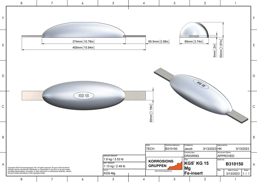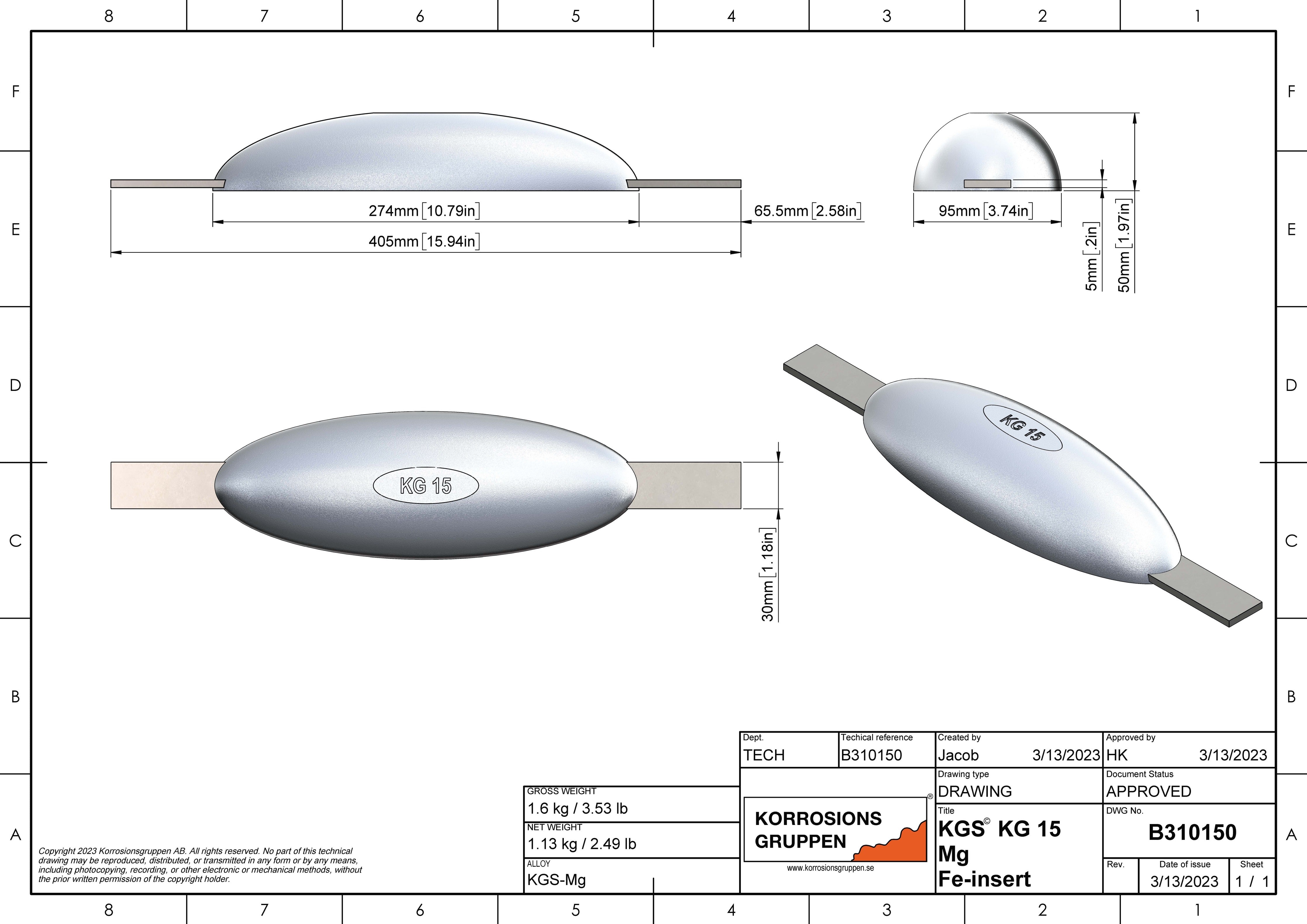 Anode en magnésium TYPE 15 - 274*95*50, (405 mm), env 1,5 kg. AZ63-1,5VDc
