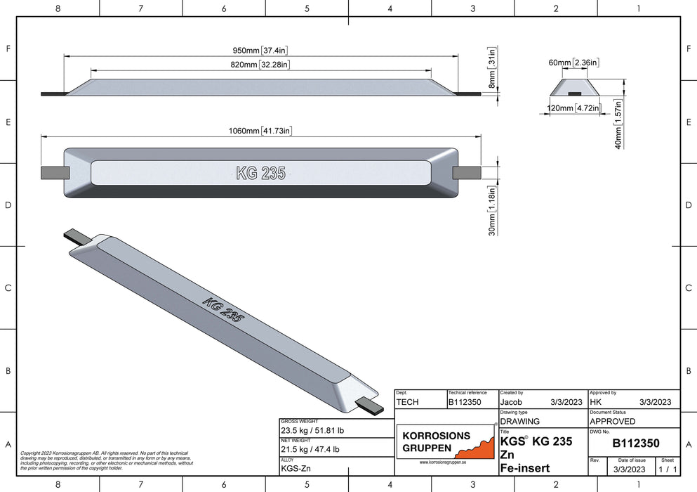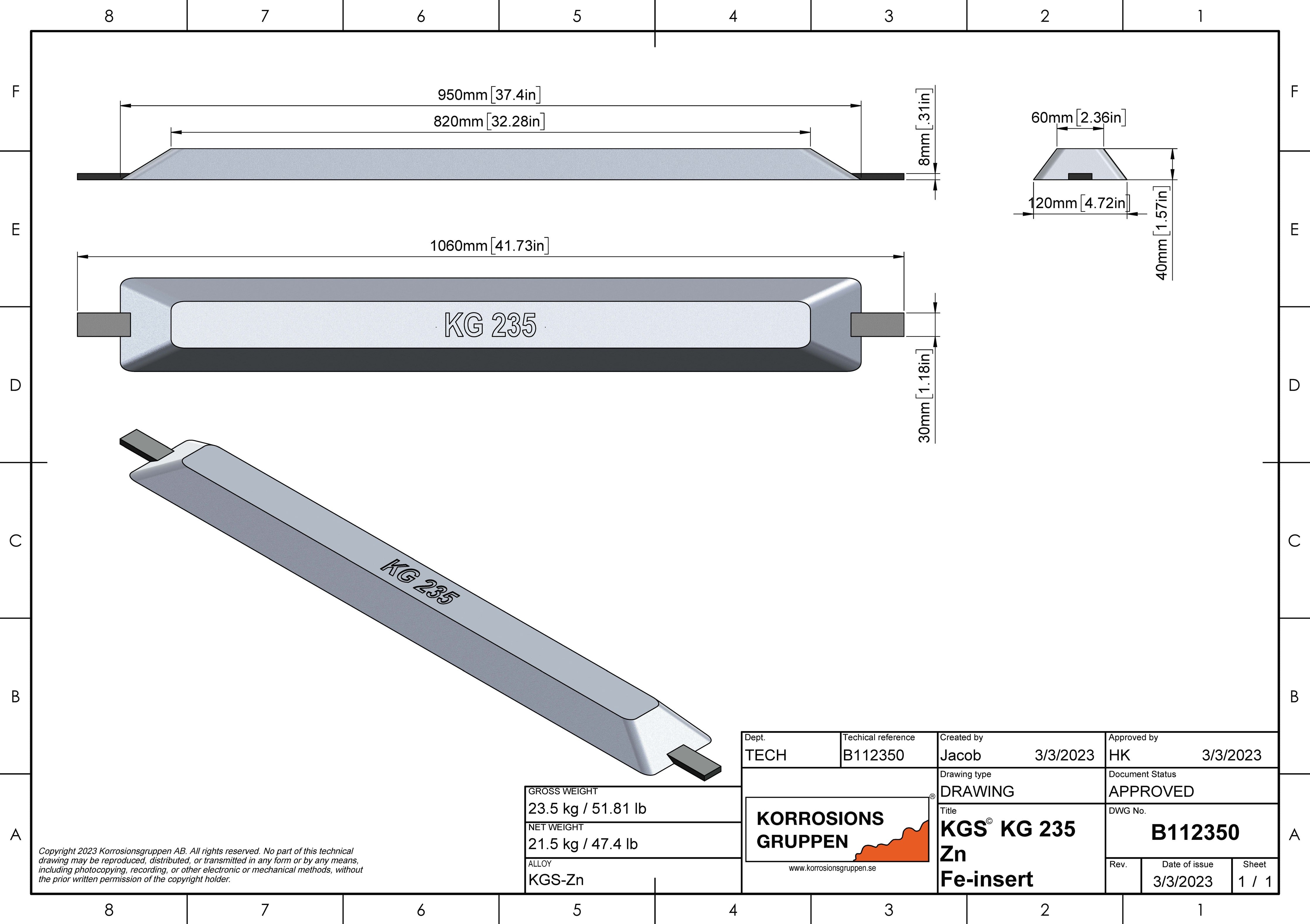 Zinc Anode Type 235 - 950 * 120 * 40, B112350